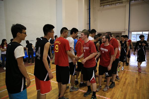 5月22日下午,北校区篮球馆人声鼎沸,掌声阵阵。我校男子篮球队同美国内布拉斯加林肯大学(University of Nebraska-Lincoln)和奥本大学(Auburn University)来校访学学生之间的篮球友谊在此进行。
