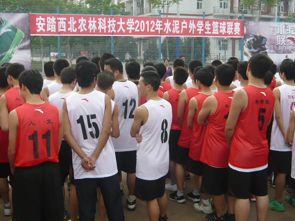 4月23日,安踏西北农林科技大学2012年水泥户外学生篮球联赛开幕式在北校区篮球场隆重举行。来自我校各个学院的百余名篮球运动员将在为期三周的比赛中为冠军展开激烈争夺。体育部主任王文博致辞,校教务处副处长李海华、学生出副处长王德连、团委副书记郭建东、体育部副主任马文军等领导出席开幕式。