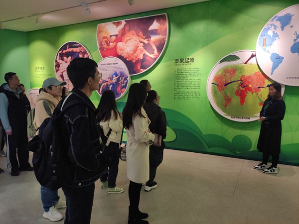 步入“中国洛川苹果博览馆”,通过丰富的文字和材料,了解了苹果的起源、演化以及传播历程。走进洛川苹果试验站,邹养军教授从试验站的功能、栽培模式等方面介绍了试验站的基本情况,为大家详细讲解了苹果酒的酿制、苹果的育种以及种植资源保护,并给大家讲述了试验站现有的苹果品种及优系。