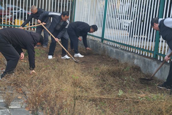 一大早,体育部职工来到责任区,自觉开始卫生清理。有人弯腰拔草,有人拿着铲锹清运,有人专门清扫。大家争先恐后,干劲十足,不怕脏,不怕累,互相配合,有的同志手上磨起了泡,有的同志的手被草划伤甚至手指流血也没有停止劳动,整个场面热火朝天,充分发挥团队合作精神。