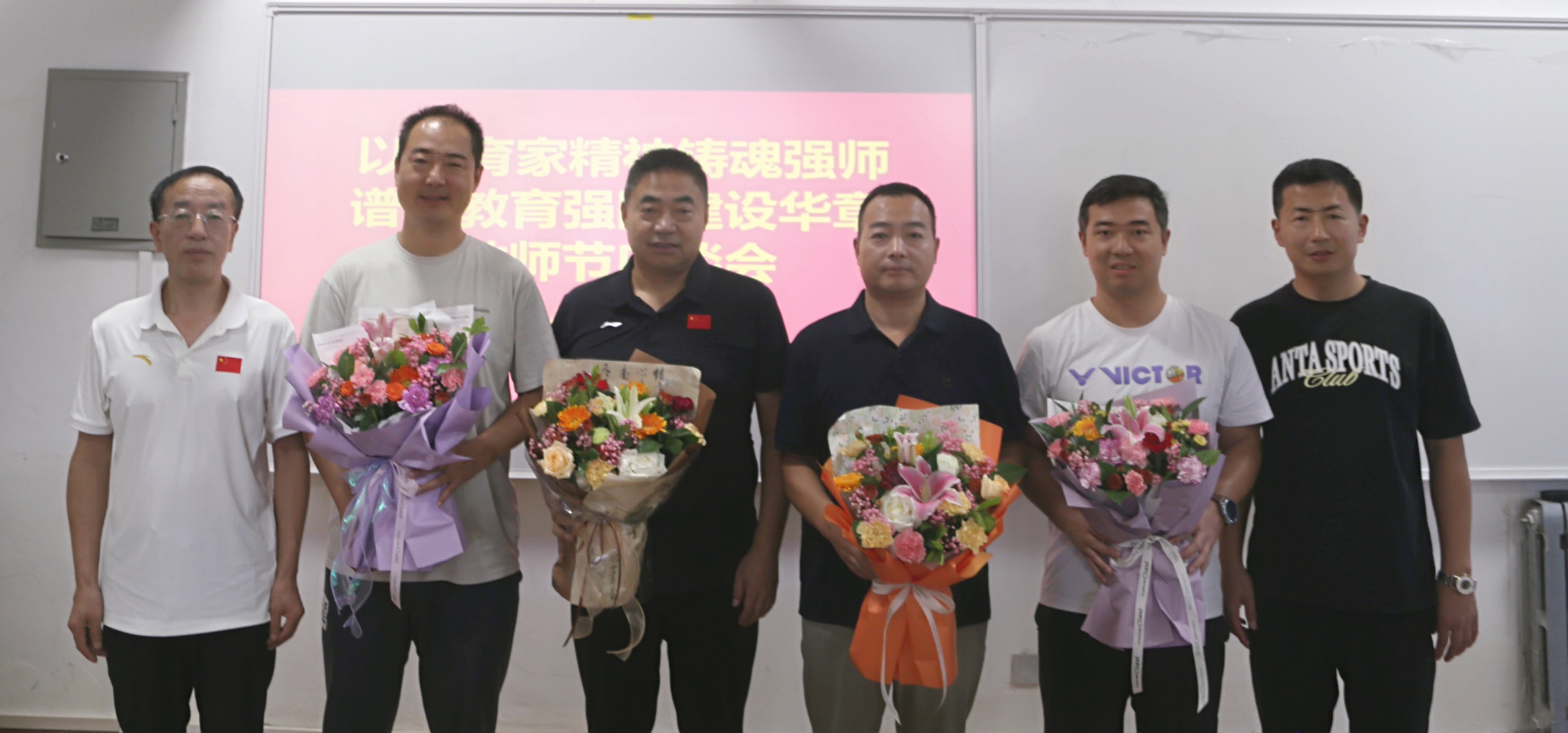 座谈会现场,举行了隆重的献花表彰仪式。体育部领导班子成员分别为在体育教学、群体竞赛、运动训练、科研创新等领域表现突出的19名教师献上鲜花。“这份荣誉不仅属于个人,更属于每一个并肩作战的体育人。